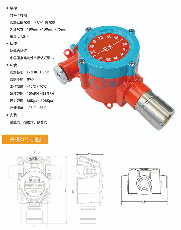 产品描述:ARD-T6000-ZLGM气体探测器为双腔体结构设计,具有现场声光报警功能,红外遥控器校零、标定等功能。两线制无极性供电和信号传输,气体探测器安装简单方便,布线经济。